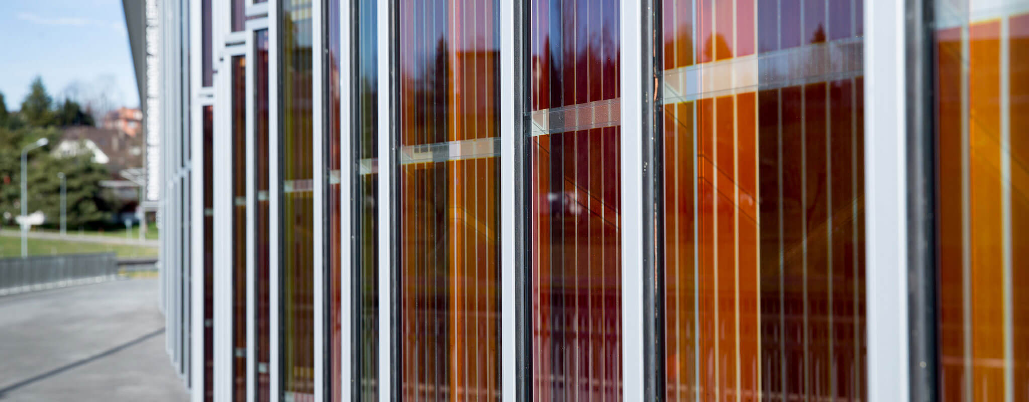 The entire west facade is covered with Graetzels cells. Invented by Professor Mickaël Graetzel at EPFL, the latter produce energy and operate in a similar way to conventional solar panels but feed on light and not on the sun, which makes them more effective in overcast weather than solar panels. In addition, they color the light that passes through and offer a natural and colorful decoration at the Campus. This is the first large-scale implementation of these cells that have many benefits.