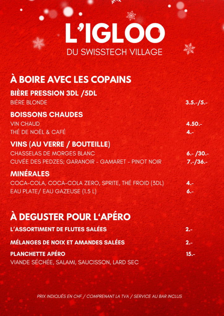 Bienvenue dans l’Igloo du SwissTech Village, ce havre idyllique pour la saison hivernale, situé au cœur de l’EPFL à Lausanne. Venez partager un moment convivial du lundi au vendredi du 19 novembre au 19 décembre 2025
